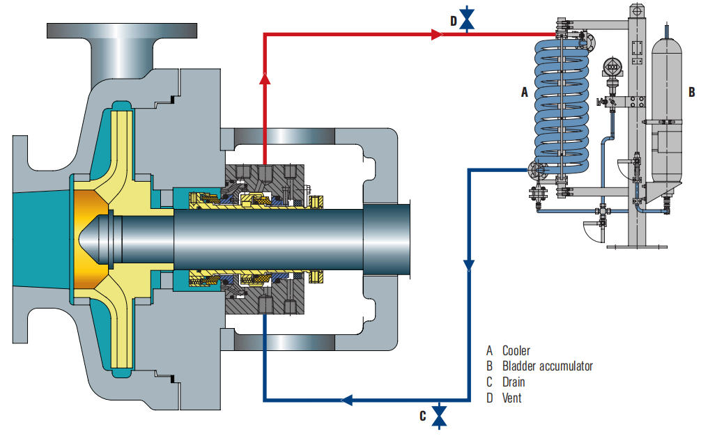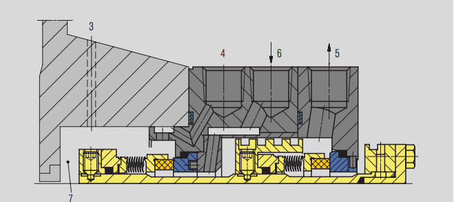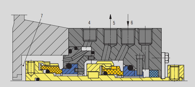 1. پمپ کے ہائی پریشر ایریا سے (پمپ خارج ہونے والے مادہ یا پمپ ڈسچارج پائپ لائن) 3. فلشنگ پورٹ (ایف) 4. کولر (Q) 5. ڈرین پورٹ (ڈی) 6. سیل چیمبر